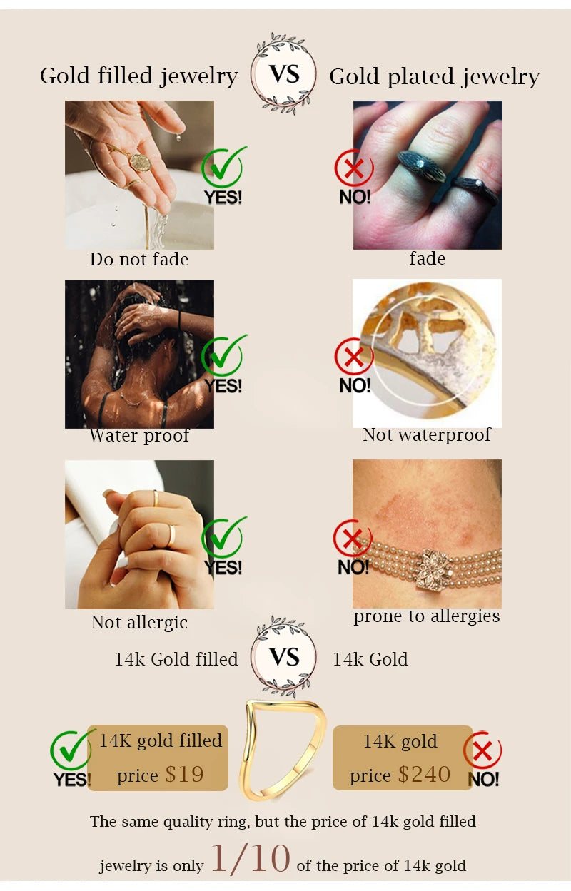 Since gold filled is mechanically bonded onto the base metal instead of plated, the gold doesn’t rub off, and it has Â