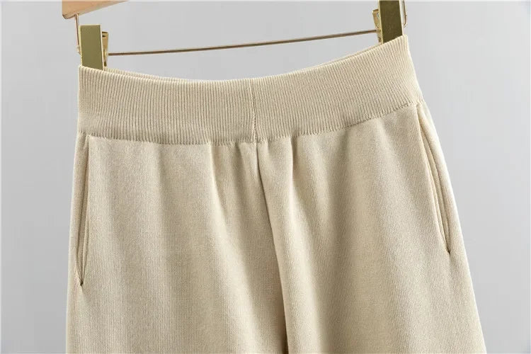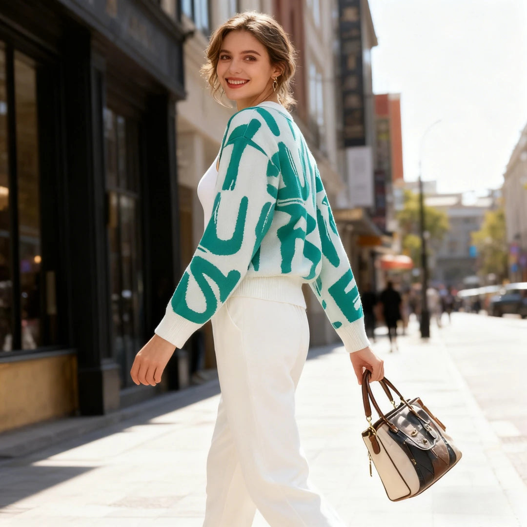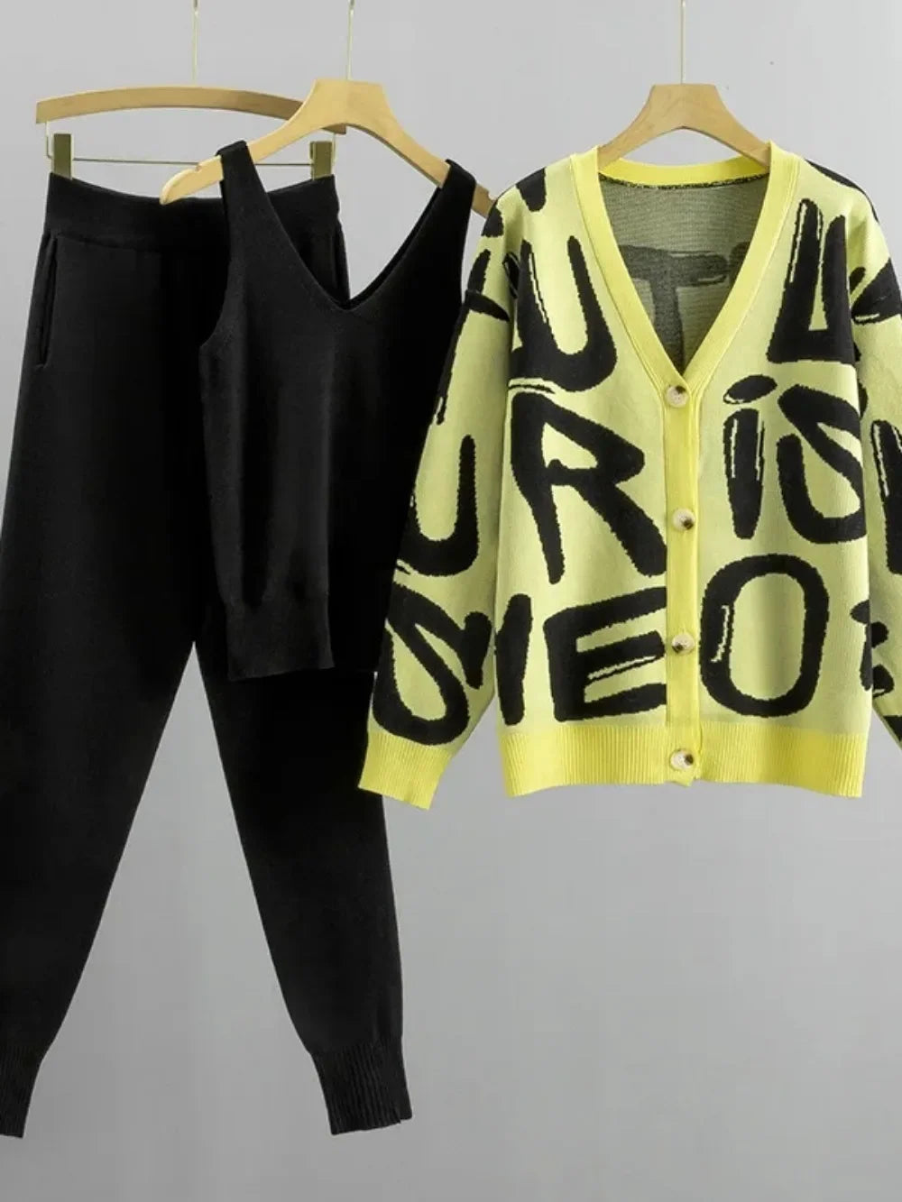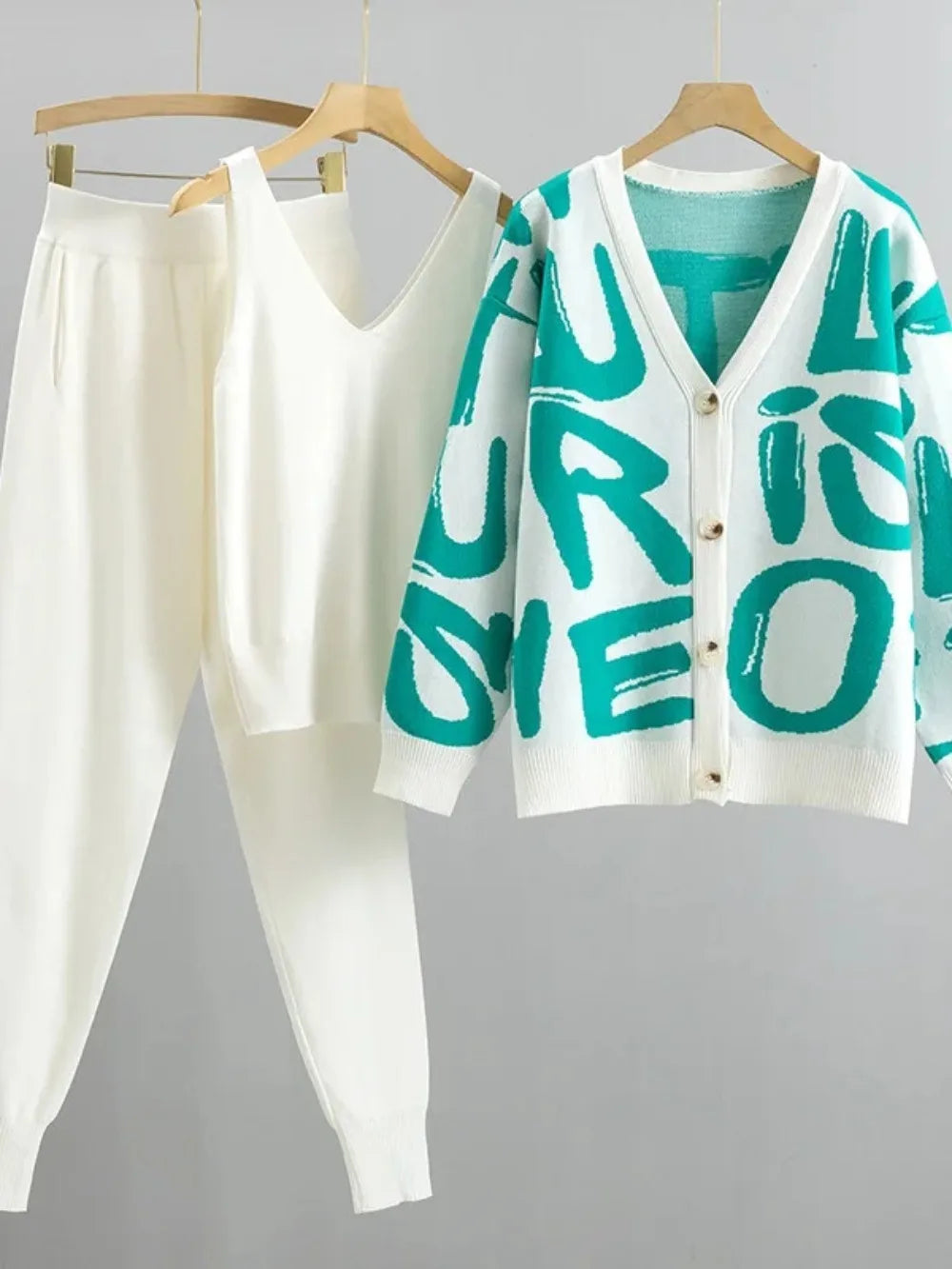 Knit Sweater 3 Piece Set Women Knitted Vest Cardigan Pencil Pants Suit Matching Sets Print Single Breasted Coat Knit Outfits