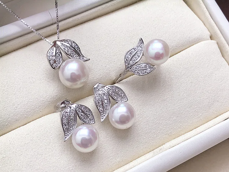 Real Pearl Earrings Necklace Pendant Ring For Women Natural Freshwater White Pearl Jewelry Set 925 Sterling Silver Jewelry Sets Gift |